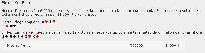 Quedan en estos momentos 1149 jugadores en el Dia 3 y Nicolas Fierro ha llegado a la módica suma de 500.000 fichas ocupando el 13º lugar ahora.